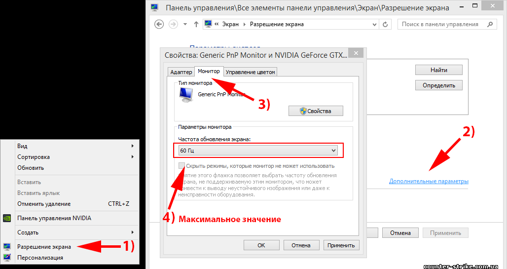2) Дополнительные параметры => вкладка Монитор => Частота обновления экрана => ставим галочку на пункте Скрыть режимы, которые монитор не может использовать и выбираем Максимальную частоту.